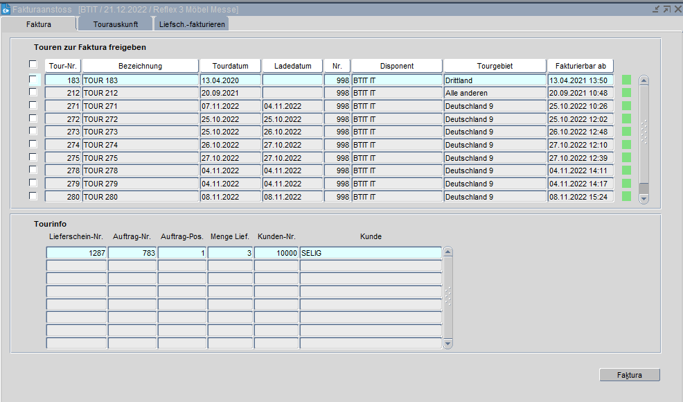 Mit diesem Menüpunkt können die Touren oder Lieferscheine zur Faktura freigegeben werden. Hierfür stehen verschiedene Registerkarten zur Verfügung. Es werden alle Touren ab dem Status „fakturierbar" angezeigt. Grün markierte Touren sind komplett gebucht, gelb markierten Touren sind noch nicht vollständig gebucht. Über das Feld „Auswahl" können alle zur Faktura freigegebenen Touren gekennzeichnet werden. Mit dem Button „Faktura" erfolgt der Fakturaanstoß für alle gekennzeichneten Touren. In der zweiten Maskenhälfte werden die Torinformationen je markierter Tour angezeigt. In der Registerkarte "Lieferschein fakturieren" werden die Aufträge auf fakturierbar gesetzt, die nicht über eine Tour laufen. Hierzu gehört z. B. der Postversand.