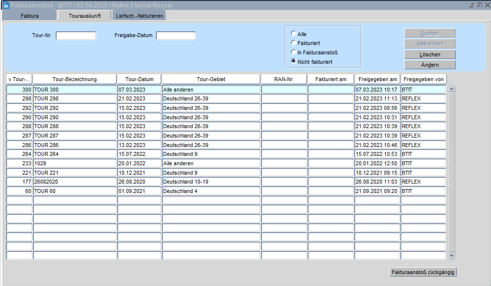 Über das Suchkriterium „In Fakturaanstoss“ können Tour-Nr. angezeigt werden, zu denen der Faktura-Anstoss bereits durchgeführt wurde, die Tour aber noch nicht fakturiert ist.