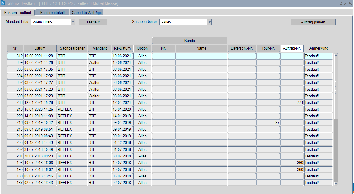 Bestimmte Stammdaten müssen für einen erfolgreichen Fakturalauf vorhanden sein. Ist nicht immer sichergestellt, dass alle Daten tatsächlich vorhanden sind, könnte der Fakturalauf auf einen Fehler laufen. Um das zu verhindern besteht die Möglichkeit eines Testlaufes. Laufen Fehler auf, so sind diese in der Registerkarte Fehlerprotokoll zu sichten. Aufträge können vorübergehend aus dem Fakturalauf über eine Parkfunktion ausgeschlossen werden.