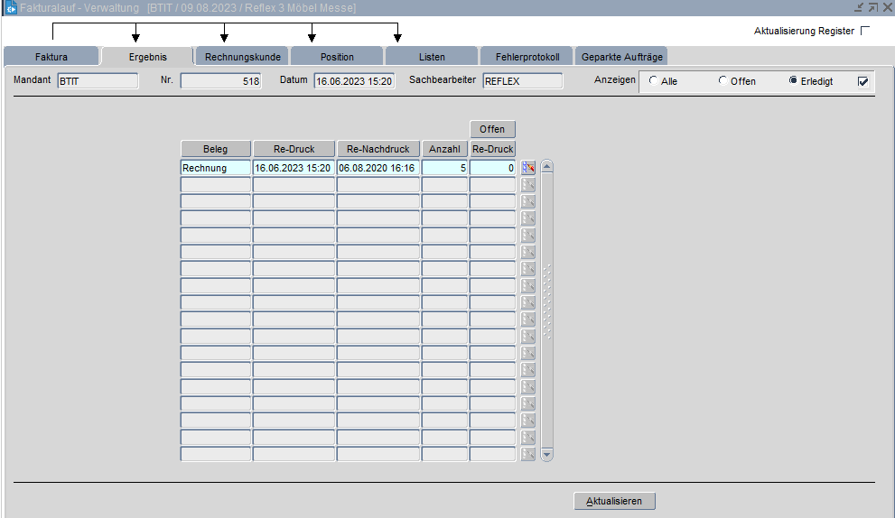 Über die Schaltflächen Anzeigen: „Alle, Offen, Erledigt" alle bisherigen Fakturaläufe, alle offenen Fakturaläufe (Rechnungsdruck ist noch nicht erfolgt) oder alle erledigten Fakturaläufe (Rechnungsdruck ist bereits erfolgt) wird bestimmt, welche Fakturaläufe angezeigt werden sollen.