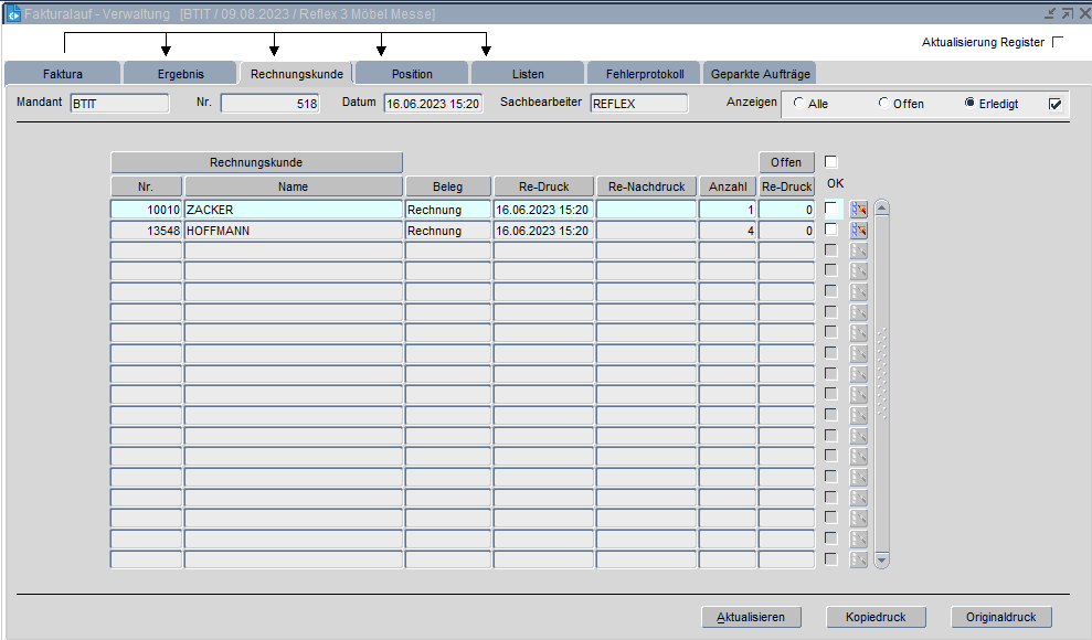 Über die Schaltflächen Anzeigen: „Alle, Offen, Erledigt" alle bisherigen Fakturaläufe, alle offenen Fakturaläufe (Rechnungsdruck ist noch nicht erfolgt) oder alle erledigten Fakturaläufe (Rechnungsdruck ist bereits erfolgt) wird bestimmt, welche Fakturaläufe angezeigt werden sollen.