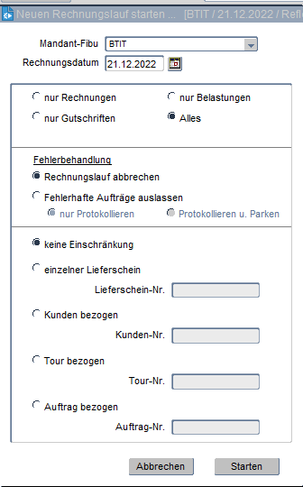 Angabe ob die Fakturierung für einen bestimmten Mandanten oder für alle vorhandenen Mandanten gestartet werden soll.