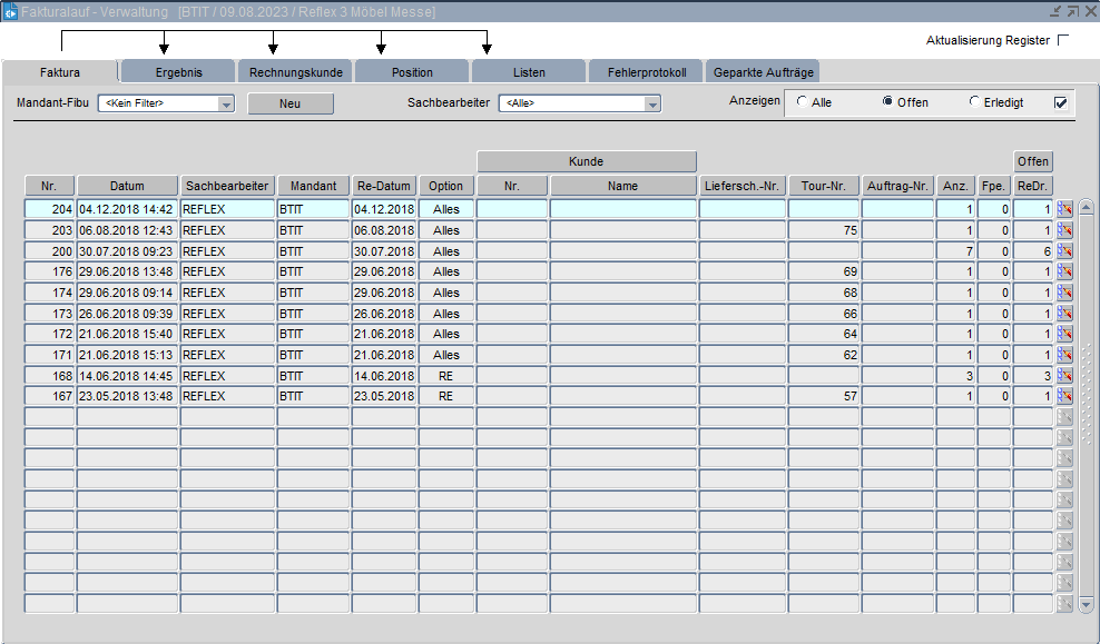 Über die Schaltflächen Anzeigen: „Alle, Offen, Erledigt" alle bisherigen Fakturaläufe, alle offenen Fakturaläufe (Rechnungsdruck ist noch nicht erfolgt) oder alle erledigten Fakturaläufe (Rechnungsdruck ist bereits erfolgt) wird bestimmt, welche Fakturaläufe angezeigt werden sollen.