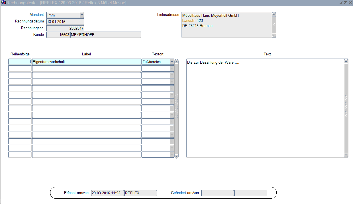 In dieser Maske besteht vor dem Rechnungsdruck noch die Möglichkeit, für ausgewählte Rechnungen verschiedene Texte im Kopf- oder Fußbereich zu erfassen.