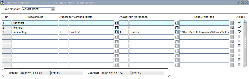 Für die Fertigmeldung können unendlich viele verschiedene Fertigmeldestellen eingerichtet werden. Diese werden dann im Menüpunkt "Fertigmeldung Profil" dem "Profil" (das kann ein User oder eine Abteilung einer Fertigungsstraße) zugeordnet werden. Für den automatischen Druck der Etiketten, Warenpässe und Labels werden an dieser Stelle die Drucker bzw. das Verzeichnis hinterlegt werden.
