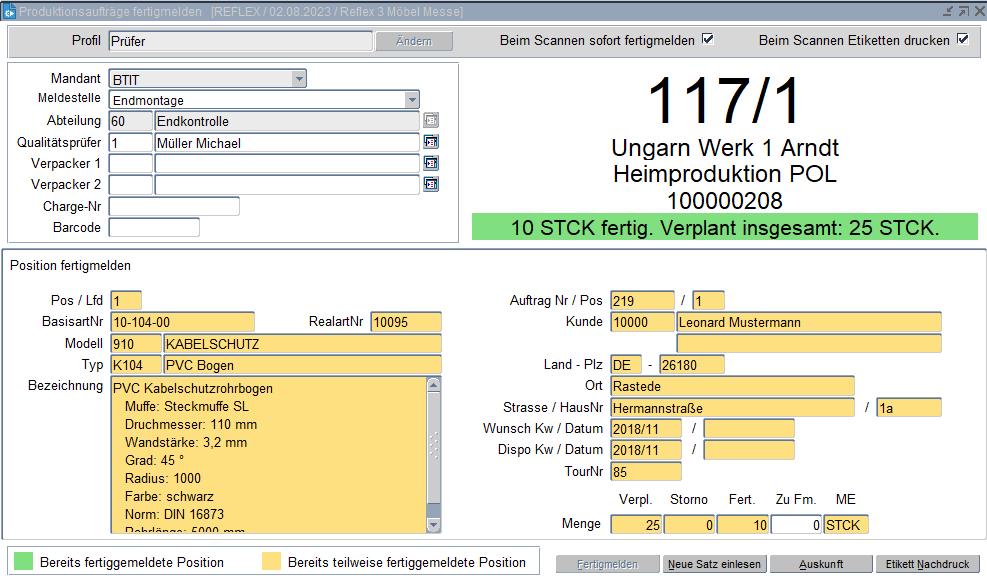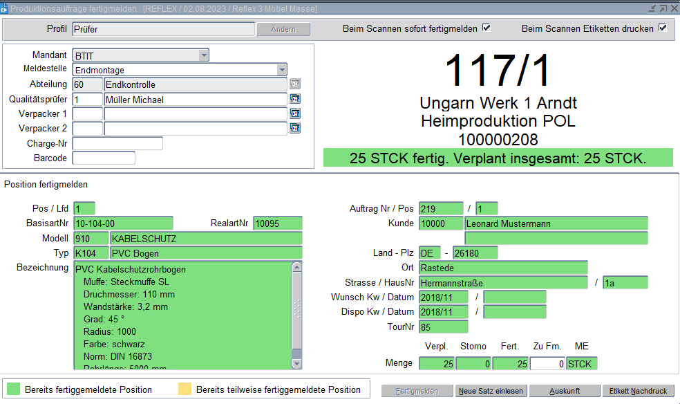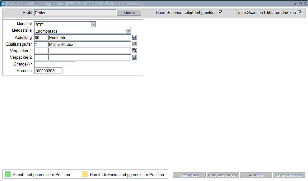 Die Fertigmeldung der Positionen können in dieser Maske per Barcode vollzogen werden.