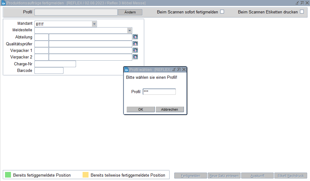 Nach Aufruf des Programms wird das Fertigmeldeprofil des Mitarbeiters abgefragt. Auch dieses kann anhand eines Barcodes erfasst werden. Über das Scannen des Barcodes der Arbeitskarte können auch Teilmengen fertig gemeldet werden.