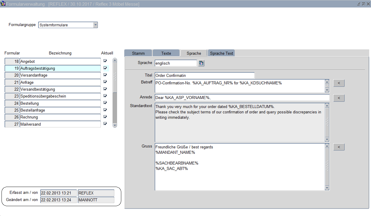 Text, der standardmäßig auf dem Formular gedruckt werden soll. Gewählt wird der Text über die Registerkarte Texte - mit dem Kennzeichen Default. Hier wird nur der übersetzte Text angezeigt, der in der Form Textbausteine gespeichert wurde.