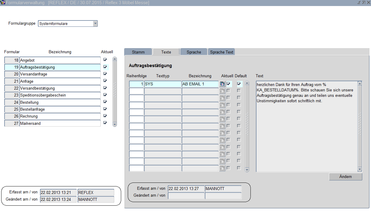 Der Texttyp wird automatisch durch die vorherige Wahl der Formulargruppe (Kundenauftrag, Reklamation, Systemformulare) vorgeschlagen.