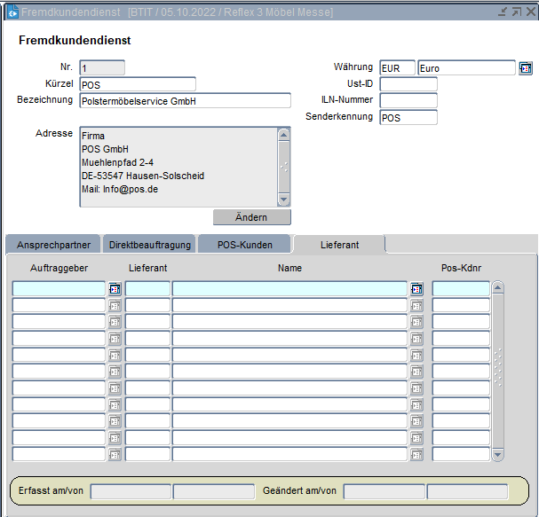 ServiceStammdatenFremdkundendienst Fremdkundendienst Lieferant Fremdkundendienst - Lieferant In dieser Registerkarte können für die Lieferanten (Lieferwerke) die entsprechenden POS-Kundennummern hinterlegt werden, die bei einer Übertragung an die Fremdkundendienste übermittelt werden sollen.