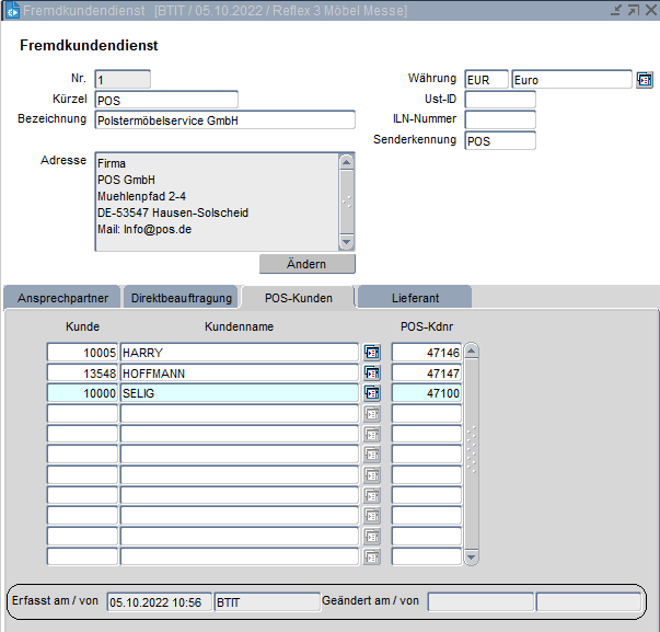 Damit der Möbelhausname in der POS-Direktbeauftragung angezeigt werden kann, wurde die Form „Fremdkundendienst" um die Registerkarte „POS-Kunden" erweitert. Hier erfolgt die Zuordnung Reflex-Kunde zu POS-Kunde.