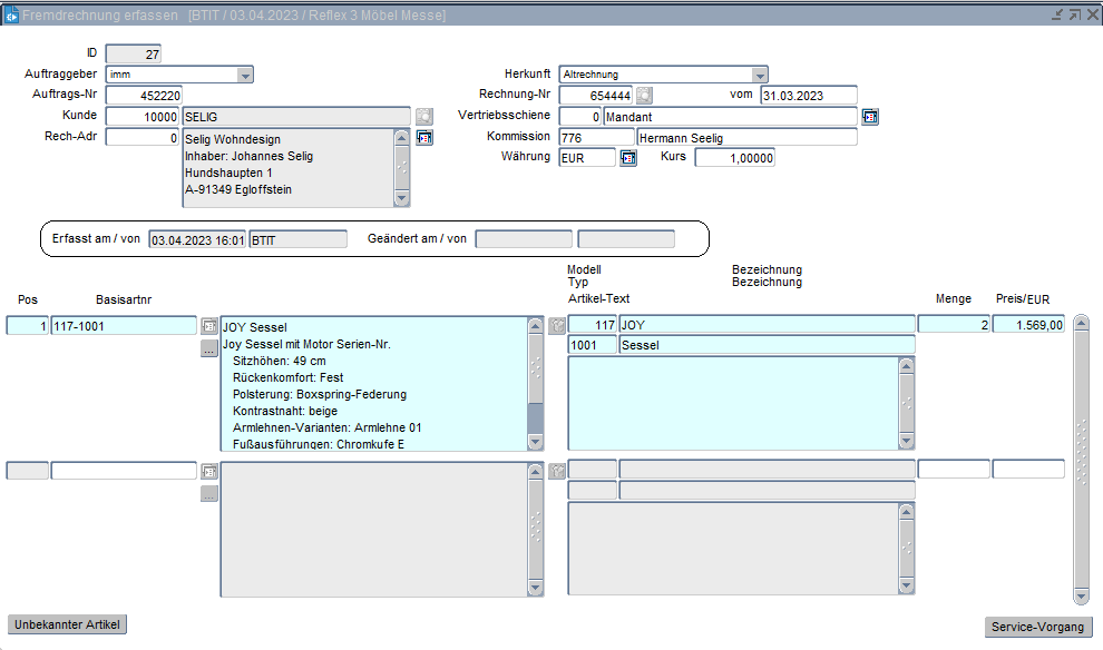 Mit dem Button Reklamation wechselt das System in die Reklamationserfassung. Hier können nun die Vorgänge für diese „Fremdrechnung" angelegt werden.