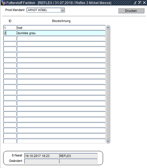 Im Regelwerk bzw. in der Mengenregel kann der Materialverbrauch, der vom Futterstoff-Farbton abhängt, eingegeben werden. Die grundlegenden Stammdaten hierfür werden in dieser Maske hinterlegt - die Zuordnung zum Basisartikel wird im Menüpunkt "Basisartikel Einstellungen" vorgenommen.