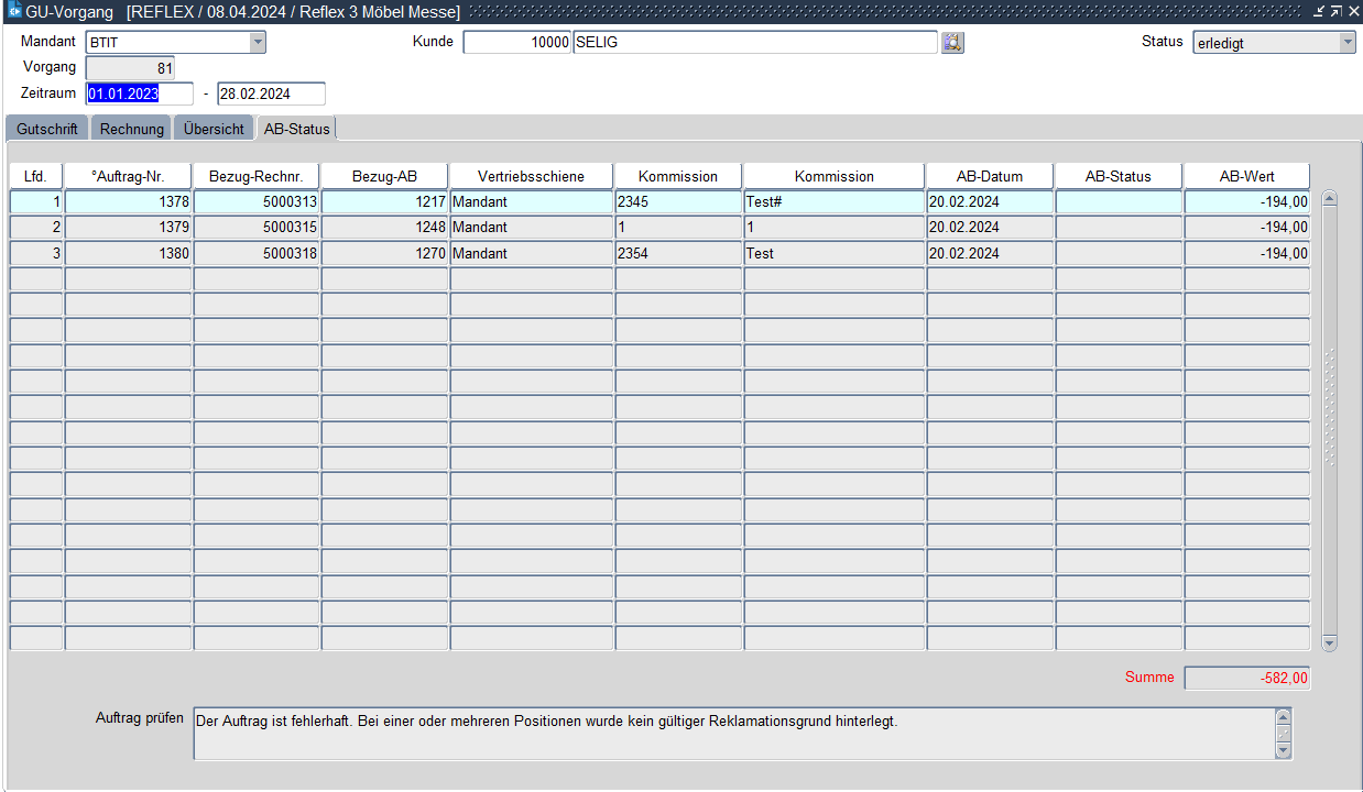 In der Registerkarte „AB-Status“ werden die erstellten Gutschriften angezeigt und der GU-Vorgang ist erledigt. Die erstellten Gutschriften müssen in der Anwendung „Auftragserfassung“ nicht mehr mit dem Button „Auftrag OK“ abgeschlossen werden. Bei dem angezeigten AB-Wert handelt es sich um den NENE-Wert der Rechnung.