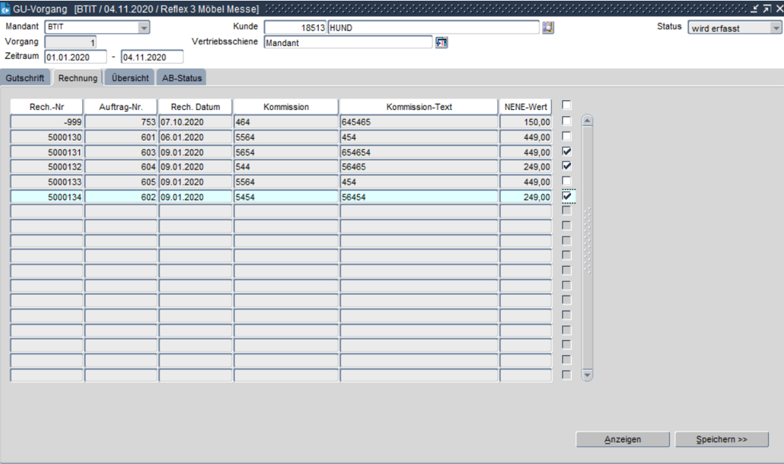 Im Register „Rechnung“ werden alle Rechnungen aus dem angelegten Vorgang aufgelistet die in Frage kommen. Über die Checkbox wird eine Auswahl der zu erstellenden Gutschriften vorgenommen. Mit dem Button „Speichern“ wird in die Registerkarte „Übersicht“ gewechselt.