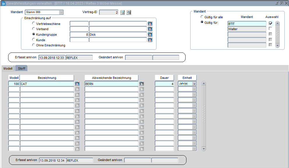 Besteht eine Sondergewährleistung für ein Modell oder einen Stoff, so wird in der Reklamationserfassung durch einen roten Button