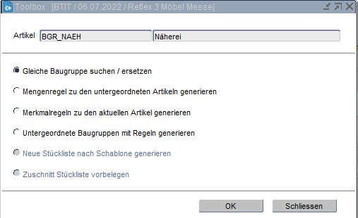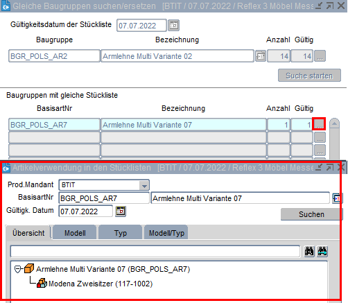 Mit dieser Funktion kann geprüft werden, ob die Stückliste einer gewählten Baugruppe bereits unter einer anderen Baugruppe existiert. In bestehenden Stücklisten kann man mit dieser Funktion die Redundanz erkennen und in kleinen Schritten aufräumen / bereinigen.