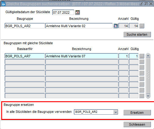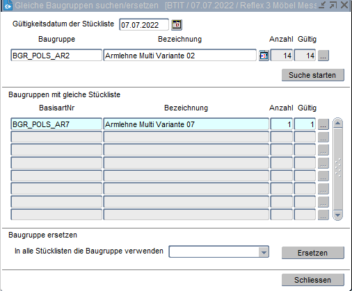 Über den Button "Suche starten" sucht das Programm Baugruppen mit gleichen Stücklisten wie die der Baugruppe im Kopf der Maske. Es wird nur die Selektion gestartet und noch nichts ersetzt.