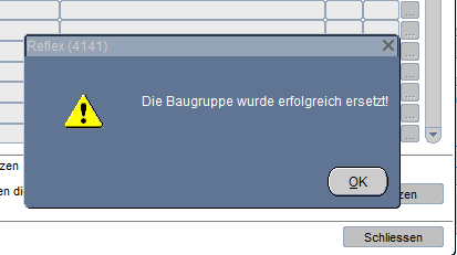 Über den Button „Ersetzen“ kann die Änderung durchgeführt werden. Dabei wird für die ersetzte Baugruppe nach einer Sicherheitsabfrage das "Gültigkeitsdatum bis" mit dem aktuellen Datum belegt und die ausgewählte neue Baugruppe mit der Gültigkeit für den morgigen Tag erfasst.