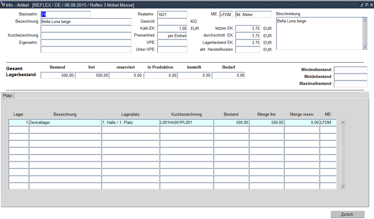 Die Form Info-Artikel verschafft dem User eine detaillierte Information über die Artikeleigenschaften, freie und reservierte Mengen sowie die Lagerbestände mit Lagerplatzangabe des Artikels.