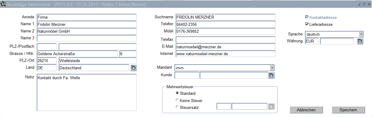 Die wichtigsten Stammdaten der Interessenten werden in diesem Programm erfasst. Mit dem Button Speichern werden die Daten in den Interessentenstamm übergeben. Die ID (Interessenten-Nummer) wird dabei automatisch vergeben. Mit dem Button Abbrechen, wird die Datenerfassung abgebrochen.