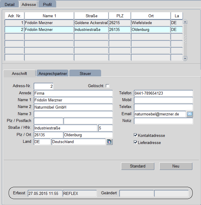 In dieser Hälfte der Maske werden alle gespeicherten Adressen des jeweiligen Interessenten angezeigt. Per Mausklick bzw. Pfeiltaste können die entsprechenden Adressen angewählt oder per Abfragemodus (F7) selektiert werden (F8). Änderungen oder Neueingaben finden in der unteren Hälfte der Maske in der Registerkarte Anschrift statt.