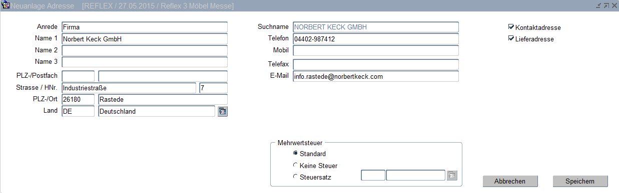 Sämtliche Adressen des Interessenten werden in der folgenden Masken erfasst. Mit dem Button Speichern werden die Daten in den Interessentenstamm übergeben. Die Adress-Nr. wird dabei automatisch vergeben. Mit dem Button Abbrechen, wird die Datenerfassung abgebrochen.