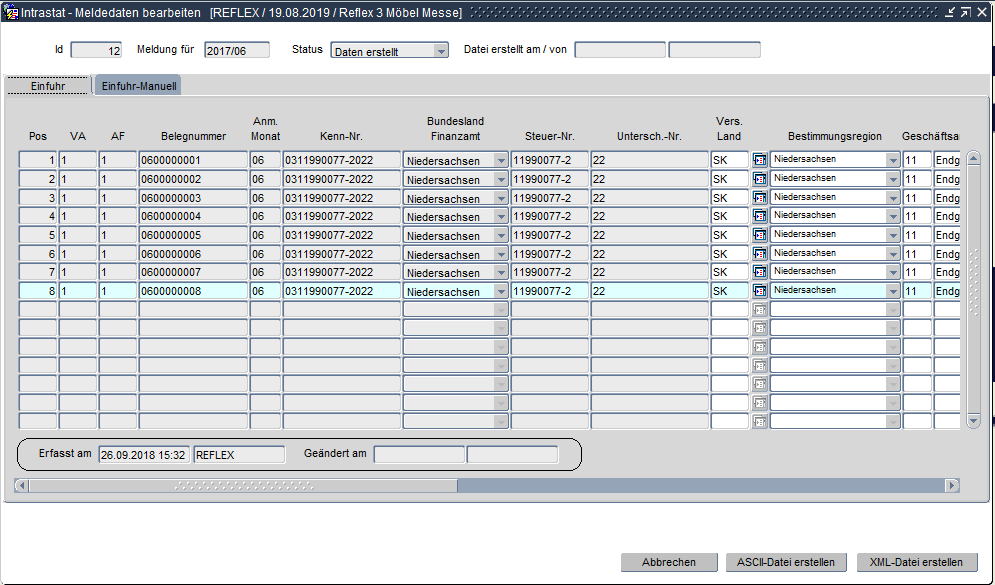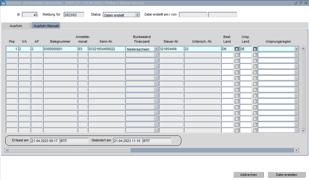 Wurde eine IntraStat-Meldung erzeugt und anschließend werden Stammdaten noch erweitert, so kann eine neue IntraStat-Meldung erzeugt werden. Wenn dies der Fall ist, so bekommt die zuvor erzeugte IntraStat-ID den Status „storniert“.
