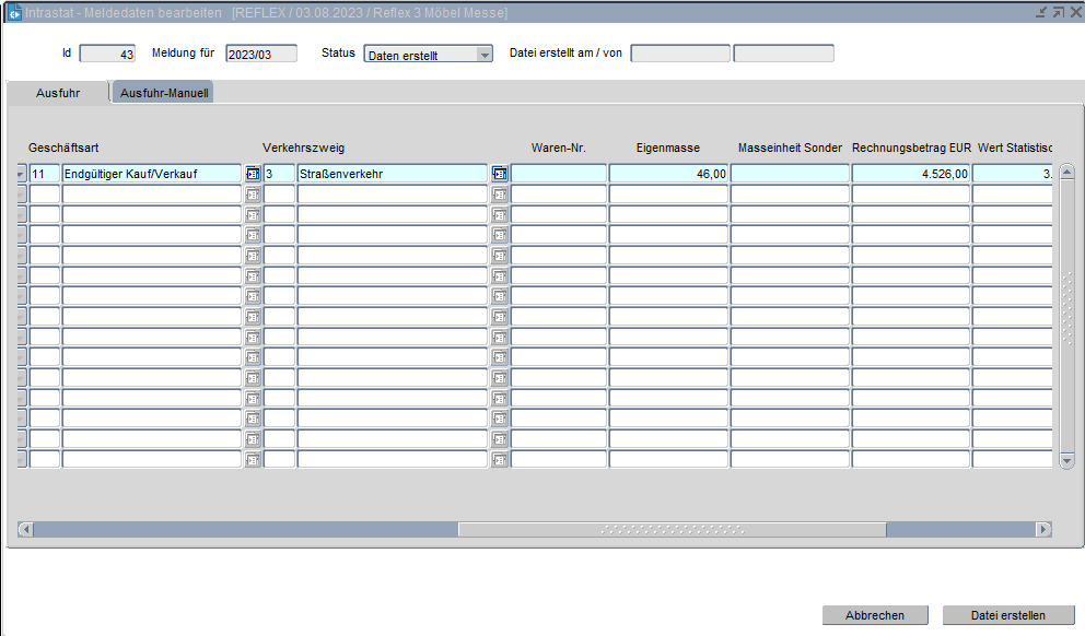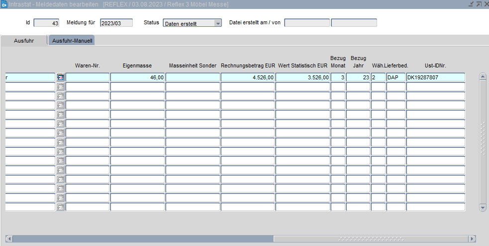 Die weiteren Felder werden mit den Daten aus dem Buchungsschlüssel „WE“ (EINFUHR) und den fakturierten Aufträgen (AUSFUHR) befüllt. Sind nicht alle Felder gefüllt, so kann die gewünschte Folgedatei nicht erzeugt werden. Die Daten können in den Stammdaten erweitert werden, dann kann die IntraStat-Meldung erneut gestartet werden und für die Zukunft stimmten die Stammdaten. Alternativ können die Einträge direkt in dieser Anwendung vorgenommen werden. (Allerdings müssen die Stammdaten dann trotzdem noch erweitert werden.)