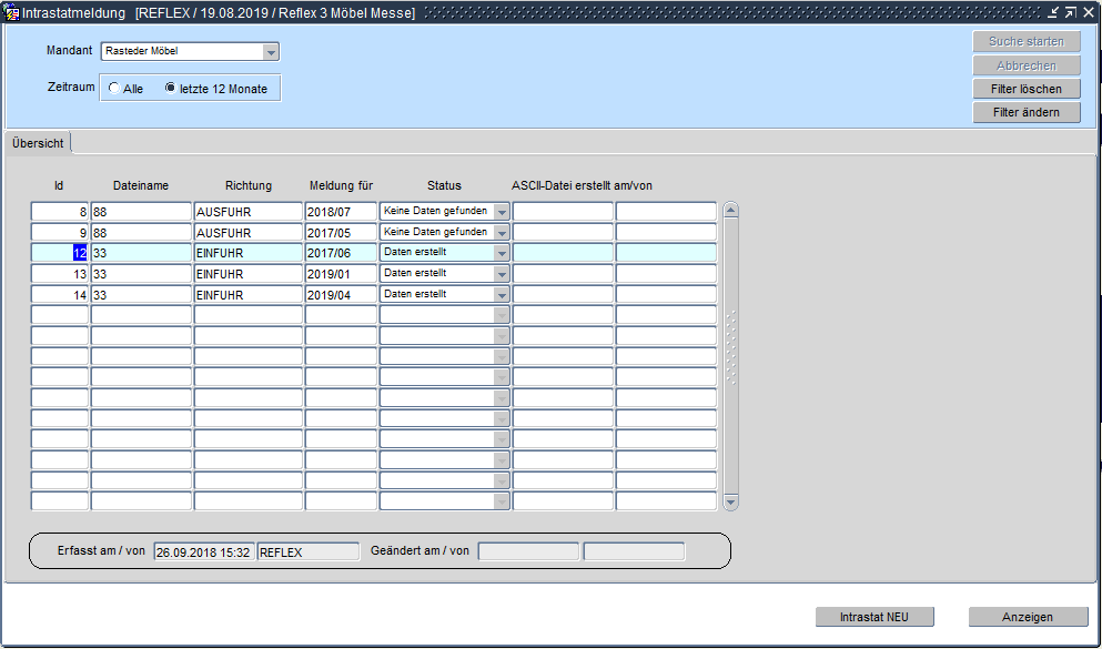 Über den Button „Intrastat NEU“ kann eine neue Meldung für den gewünschten Monat erzeugt werden.