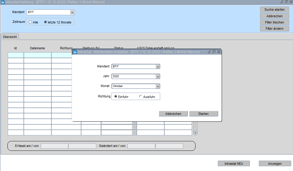 Mit diesem Button wird eine weitere Form geöffnet, in der definiert wird, für welchen Zeitraum und welche Richtung (AUSFUHR / EINFUHR) die Intrastat-Meldung erzeugt werden soll.