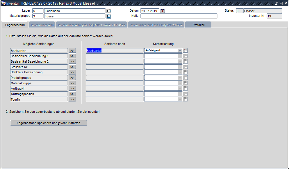 Auf der Registerkarte "Lagerbestand" ist zu definieren, in welcher Reihenfolge die Artikel auf der Zählliste ausgegeben werden sollen. Wurde die gewünschte Reihenfolge gewählt, sind die Daten mit dem Button "Lagerbestand speichern und Inventur starten" speichern und die Inventur zu starten.