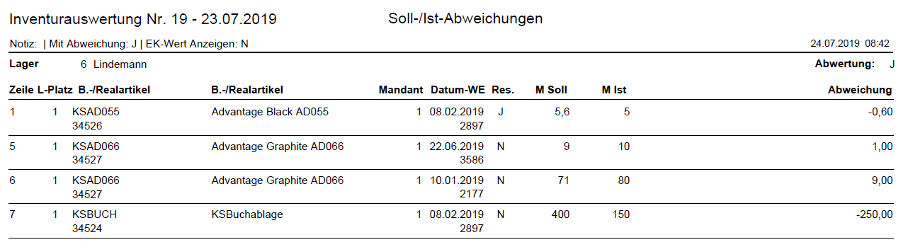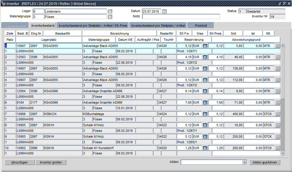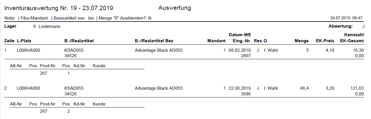 Zählliste für Fertigware: Diese Zählliste wird pro Bestands-ID ausgegeben.