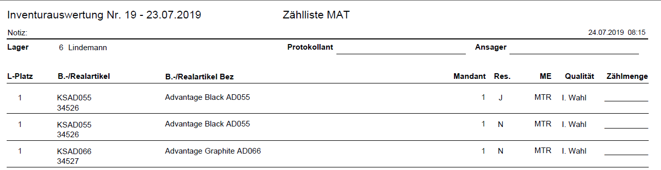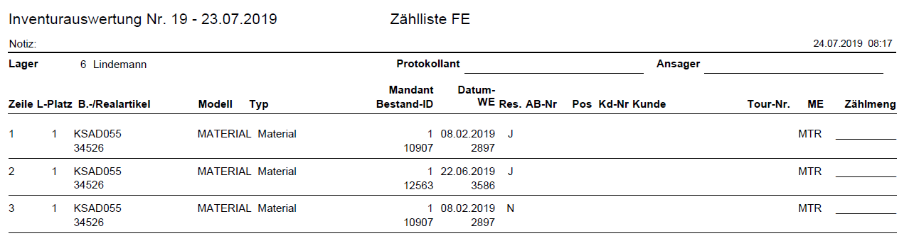 Zählliste für Material: Diese Zählliste wird pro Bestandsartikel ausgegeben.