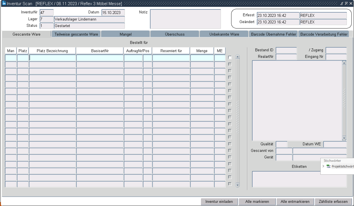 - "Mangel": Artikel, die laut Zählliste im Lager stehen, aber nicht oder nur teilweise gescannt wurden.