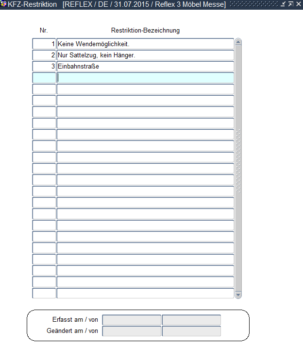 In dieser Stammanwendung können die unterschiedlichen KFZ-Restriktionen und / oder LS-Restriktionen angelegt werden, damit sie im Kundenstamm über eine Werteliste ausgewählt werden können. Die Texte der KFZ-Restriktion werden dann auf dem Speditionsschein und die Texte der LS-Restriktion auf dem Lieferschein ausgegeben.
