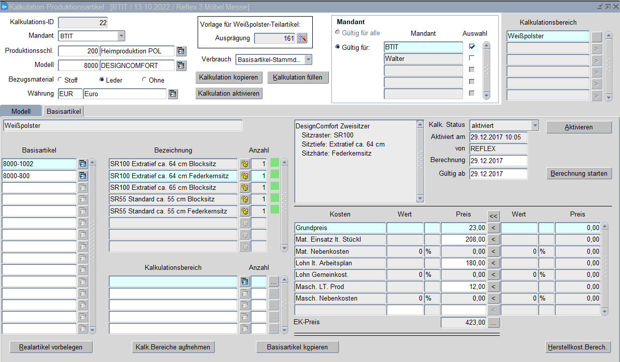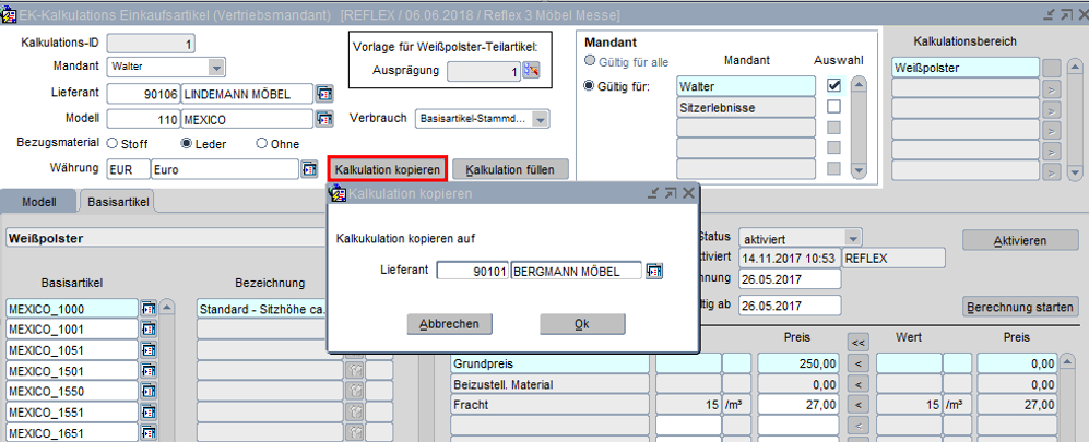 Die Einkaufskalkulation wird dann verwendet, wenn der Mandant die Möbel von einem Lieferwerk bezieht und nicht selbst produziert und es sich bei den Einkaufspreisen um Weißpolsterpreise zuzüglich Stoff/Leder-Verrechungspreise handelt bzw. wenn eine weitere Kostenart (z. B. Fracht) anfällt.