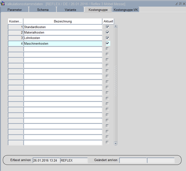 Für die Kostenkalkulation werden die Gruppierungen der Kosten an dieser Stelle angelegt. Die Daten dienen der Errechnung der verschiedenen Kalkulationen und sind daher sensibel zu handhaben.