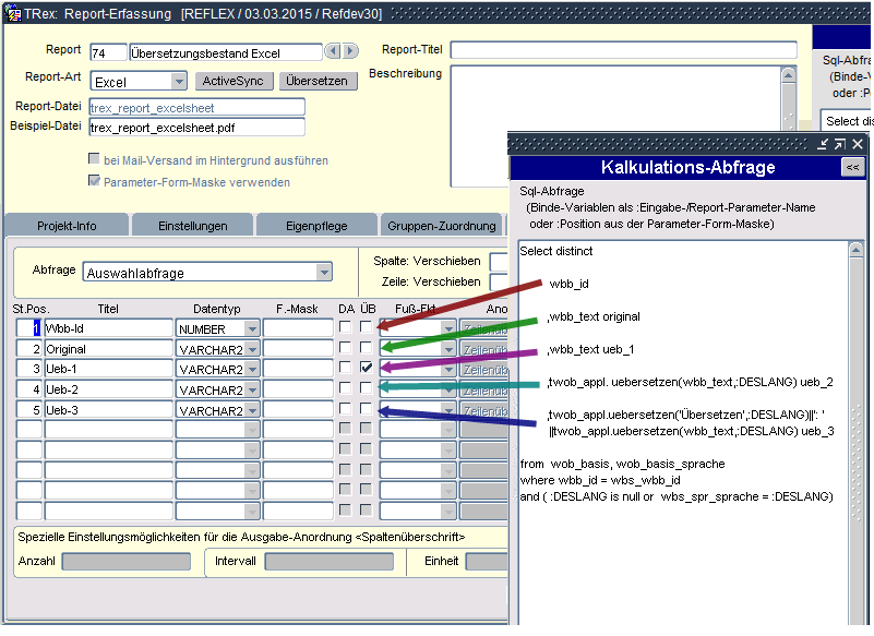Der Vorteil mit der Übersetzung über die Datenverarbeitung ist, dass in der Abfrage nicht für jede Spalte die Anweisung „uebersetzen(…,:DESLANG)“ aufgenommen werden muss.