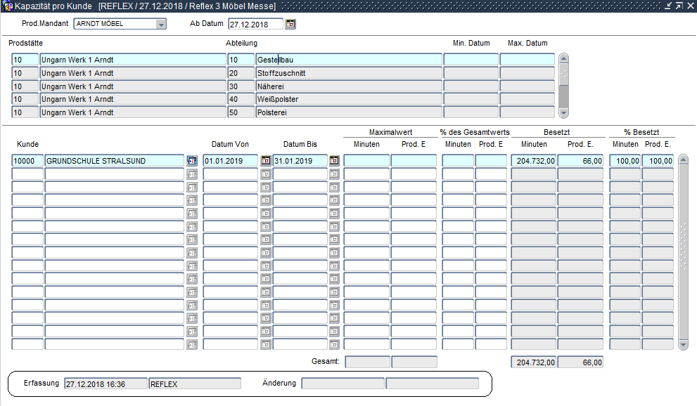 ProduktionKapazitaetsverwaltung Kapazitaet pro Kunde Kapazität pro Kunde Die Kapazitäten pro Kunde für eine Produktionsstätte und eine Abteilung können an dieser Stelle gepflegt werden.