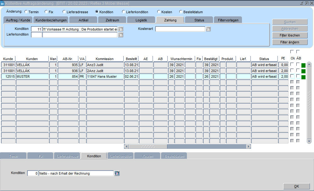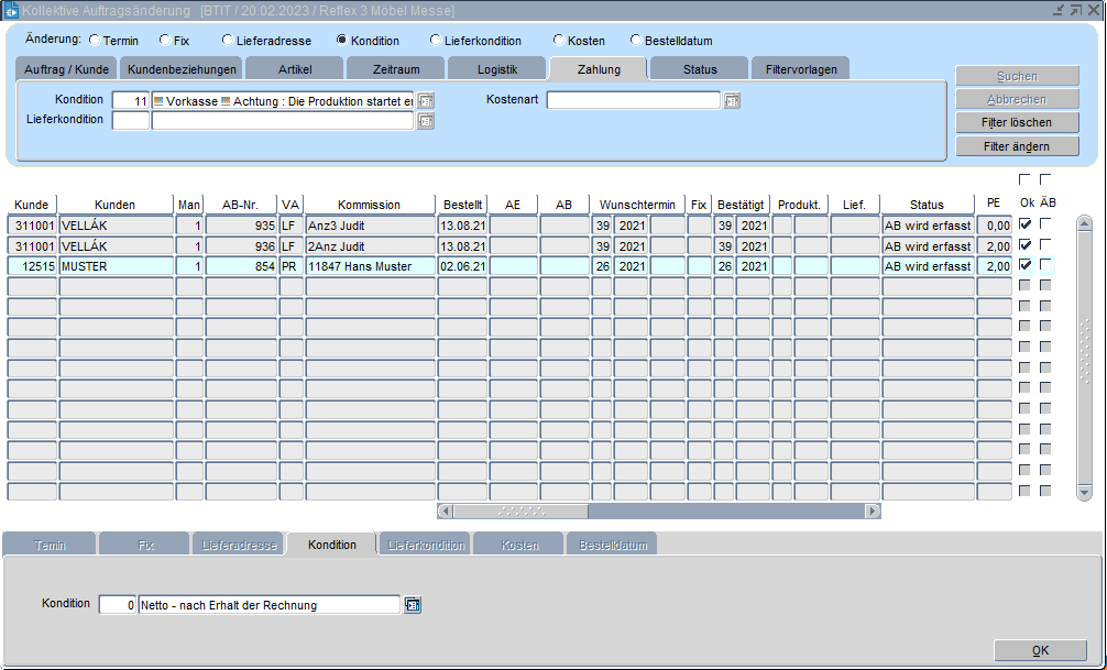 Die Änderung einer Zahlungskondition für Aufträge ist leicht möglich, so können anhand von diversen Suchregistern die entsprechenden Aufträge selektiert werden. Im Kopf wird der Radiobutton "Kondition" aktiviert, die Suche wird gestartet.
