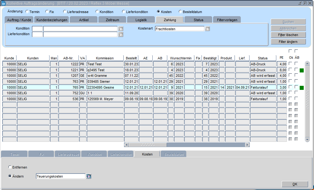 Anhand des Kontrollkästchens "OK" auf der rechten Seite des Bildschirms können die zu bearbeitenden Aufträge gekennzeichnet werden. Soll der Kunde eine Änderungsbestätigung erhalten, so muss das Kennzeichen "ÄB" entsprechend aktiviert werden. Voraussetzung hier für ist, dass die Auftragsbestätigung bereits gedruckt wurde. In die Registerseite "Kosten" im Fuß der Maske, wird die neue Kostenart erfasst, es kann auch der Button "Entfernen" zum Entfernen der Kosten aktiviert werden. Mit OK wird der Änderungslauf gestartet, es erfolgt die Sicherheitsabfrage, ob die Änderung durchgeführt werden soll.