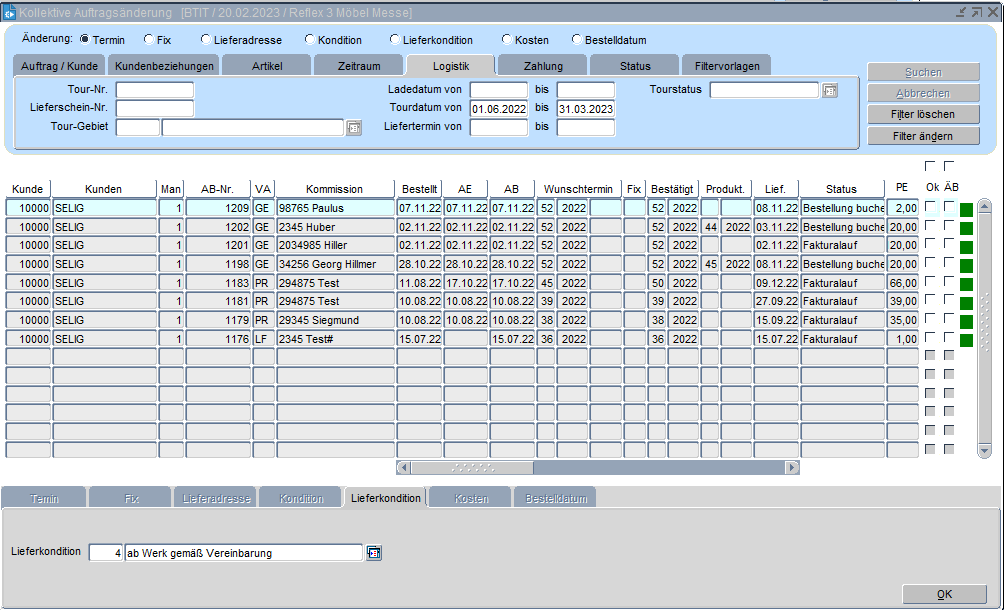 Die Änderung einer Lieferkondition für Aufträge ist leicht möglich, so können anhand von diversen Suchregistern die entsprechenden Aufträge selektiert werden. Im Kopf wird der Radiobutton "Lieferkondition" aktiviert, die Suche wird gestartet.