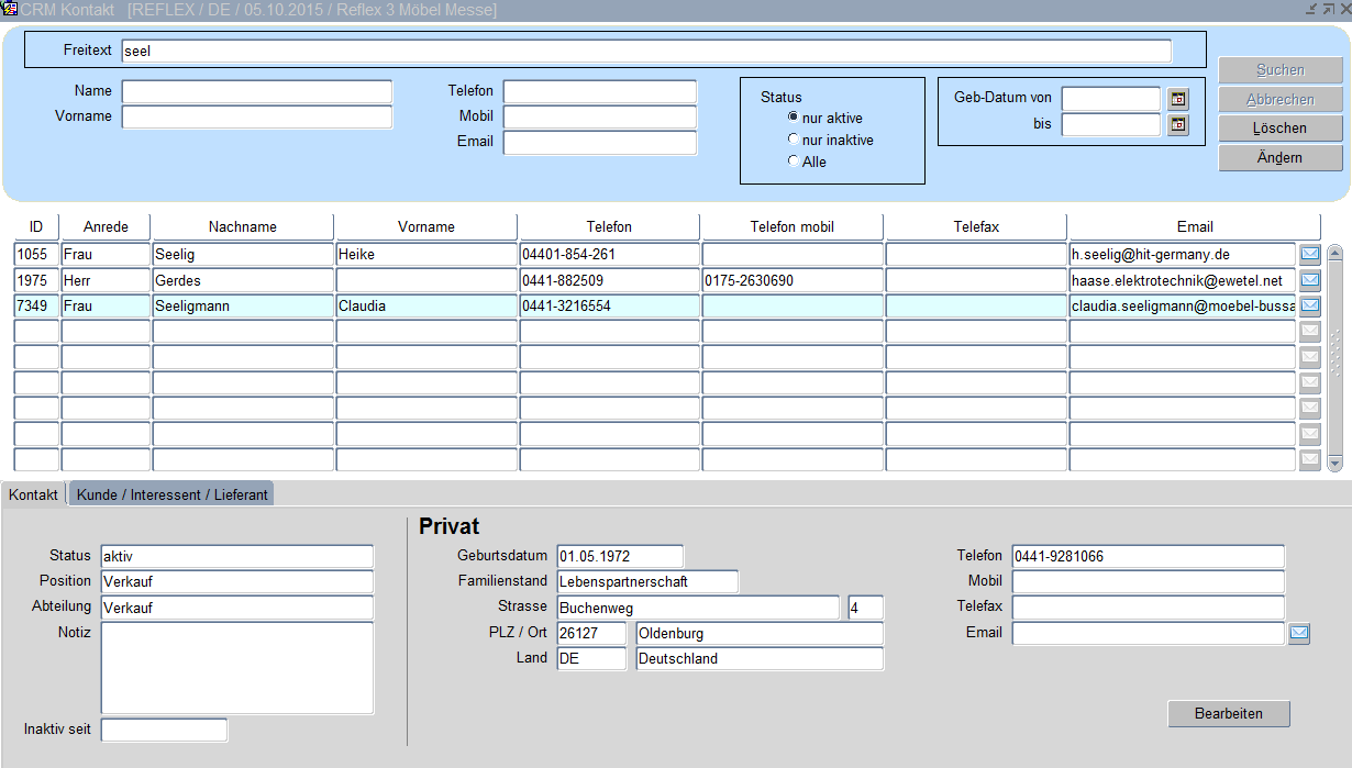 Über die Suchfunktion der Kontaktauskunft kann ein Ansprechpartner mit nur wenigen Informationen schnell gefunden werden. Ferner besteht die Möglichkeit, alle Ansprechpartner zu suchen die in einem bestimmten Zeitraum Geburtstag haben. Die wichtigsten persönlichen oder beruflichen Daten werden in den zwei Registerkarten aufgeführt. Über den Button rechts neben dem Kontakt kann das firmeneigene Mailsystem geöffnet werden wobei die Emailadresse des Kontaktes übernommen wird.