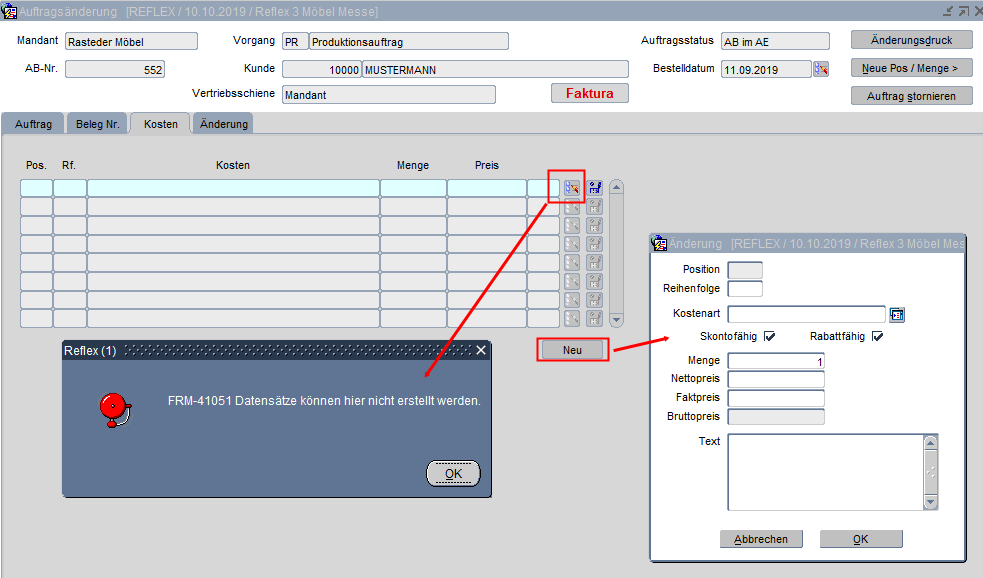 Wurden für einen Auftrag noch keine Kosten erfasst, so können diese über den Button „Neu“ noch nachträglich erfasst werden.