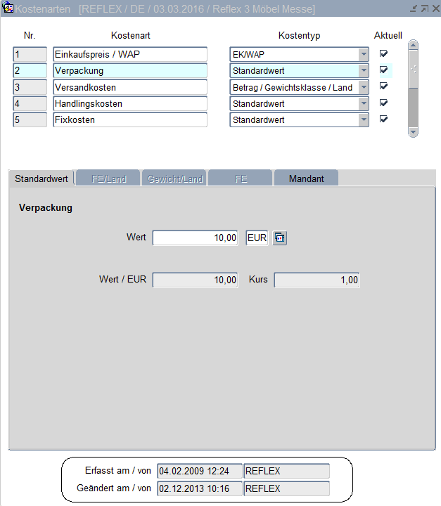 Betrag pro Gewichtsklasse / Abhol-/Lieferland - hier kann im Kostenstamm pro Land und Gewichtsklasse (KG von / bis) ein Wert eingegeben werden.