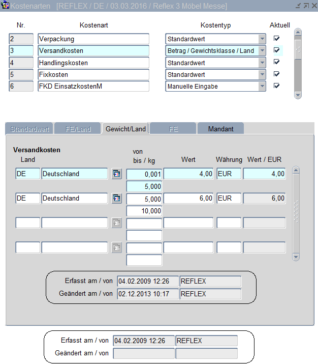 Der Wert der Kostenarten des Kostentyps „Betrag pro Gewichtsklasse/Abhol-/Liefer-Land" mit Angabe des Landes und der Gewichtsklasse in Mandantenwährung wird in dieser Maske gespeichert.