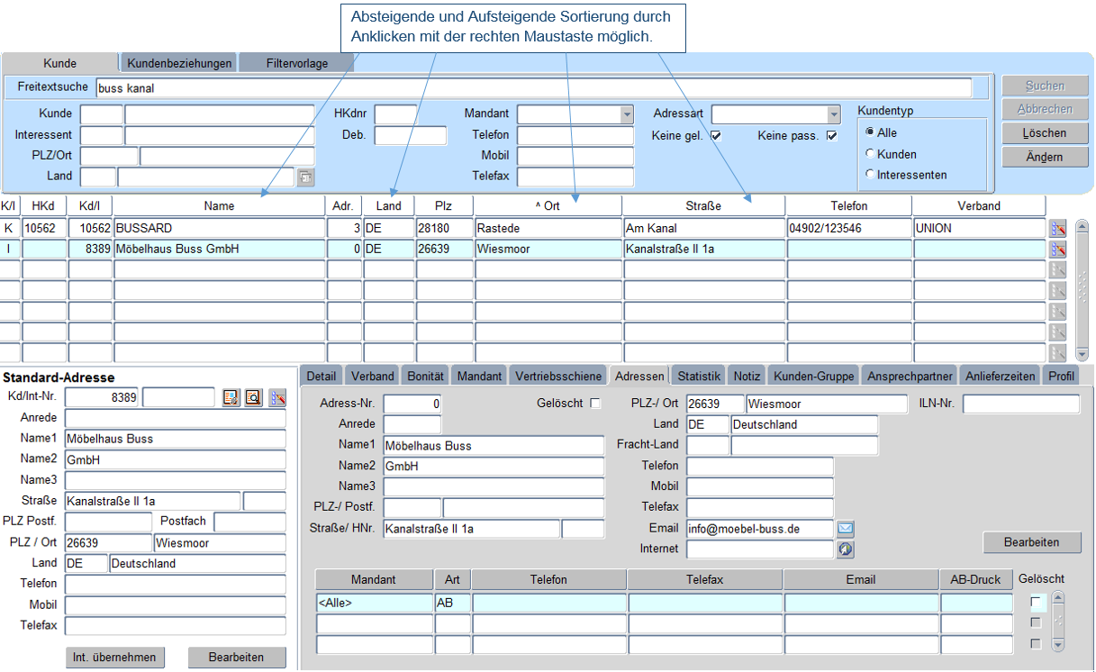 Die Ermittlung der anzuzeigenden Kunden und Interessenten kann mandantenübergreifend über verschiedene Suchkriterien in den Registerkarten Kunde und Kundenbeziehungen erfolgen. Grundsätzlich werden alle Suchkriterien in den verschiedenen Registerkarten kombiniert berücksichtigt. Ferner ist der Wechsel in die entsprechenden Kunden- und Interessenten-Stammdaten zum Bearbeiten möglich. Bei Anzeige eines Interessenten besteht die Möglichkeit, diesen durch Drücken des Buttons "Int. übernehmen" in den Kundenstamm zu übergeben. Durch das Anklicken der Spaltenbezeichnung (z. B. Name oder Straße) wird die Ergebnisspalte aufsteigend (^) bzw. absteigend (v) sortiert.