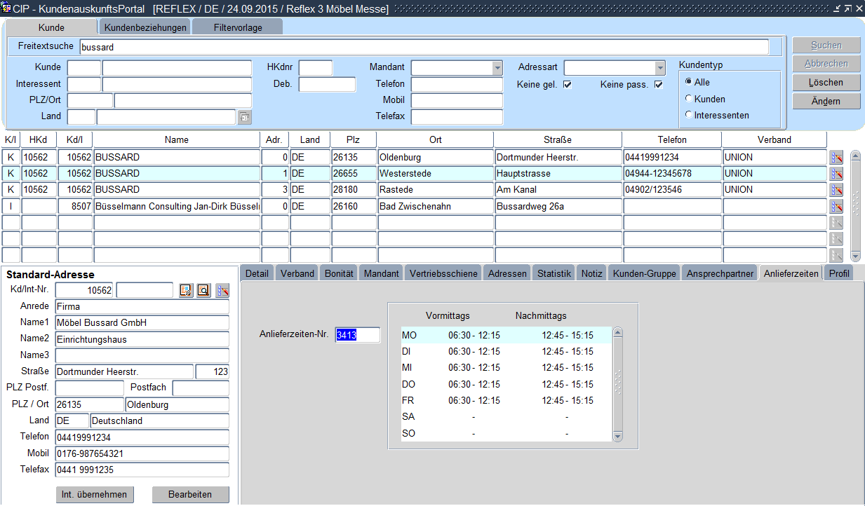 In dieser Maske werden die jeweiligen Anlieferzeiten je Kundenadresse angezeigt.