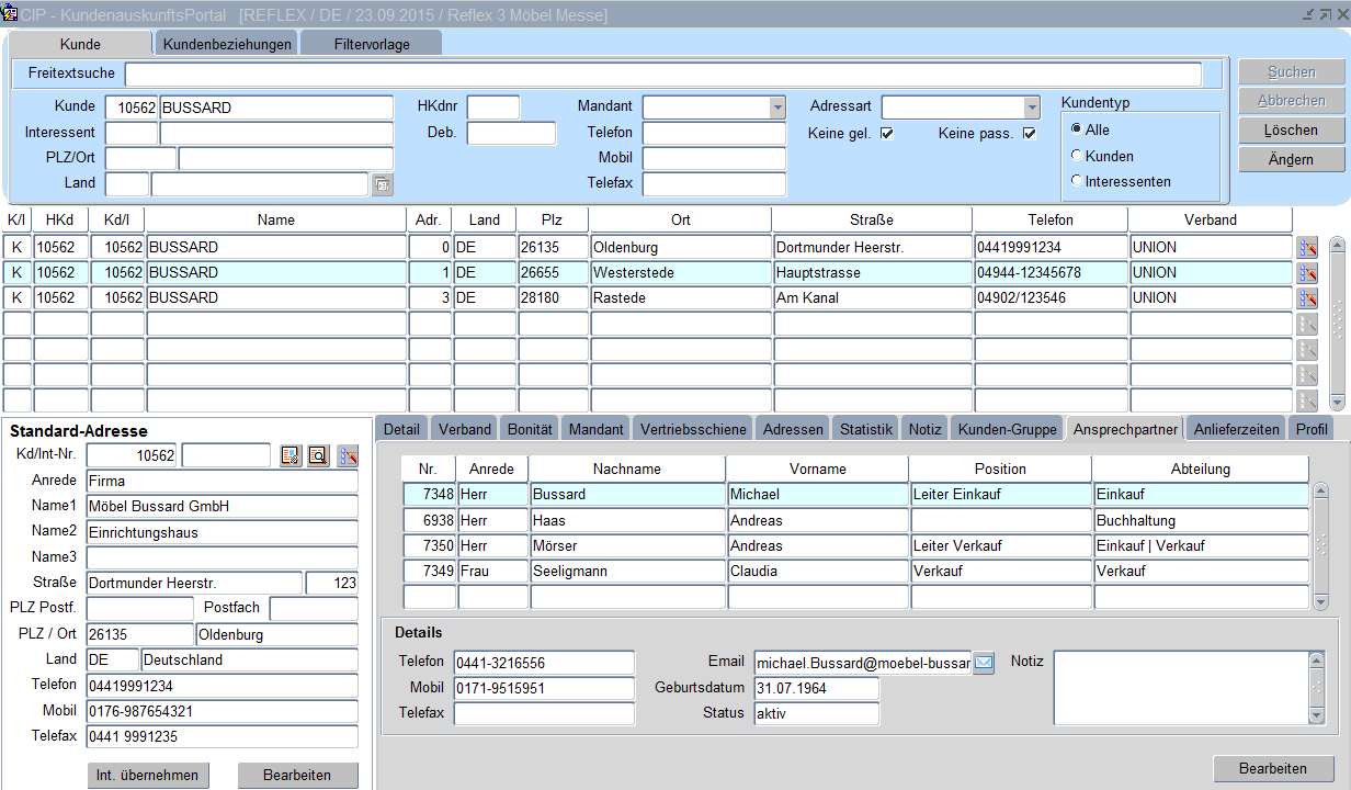 Sämtliche Ansprechpartner des Kunden werden in dieser Maske aufgeführt. Wichtige Daten wie z. B. die Telefon-Nr., Position und Abteilung dieser Person aber auch das Geburtsdatum werden hier angezeigt.